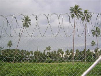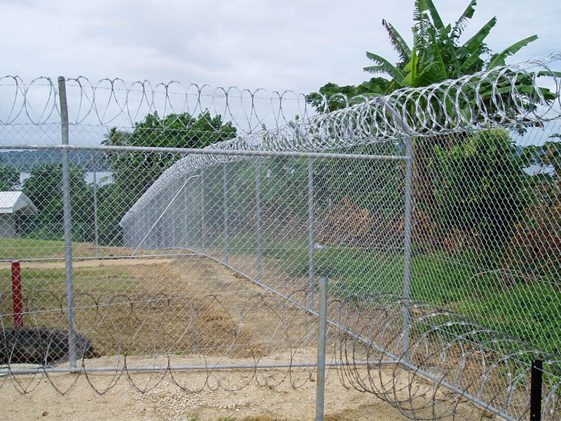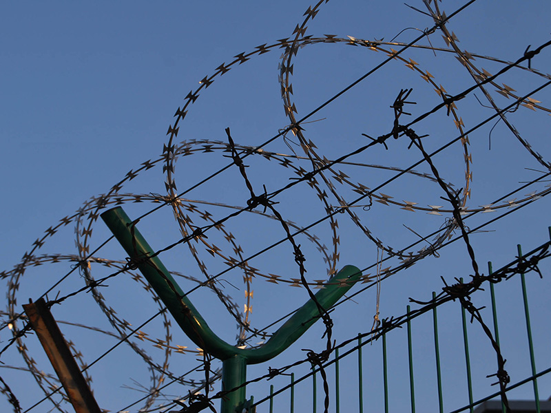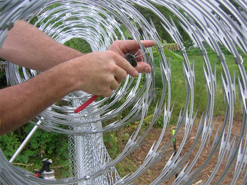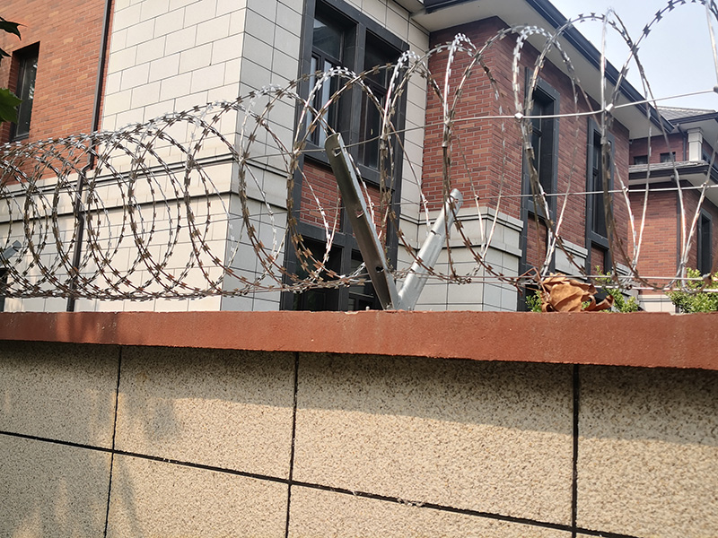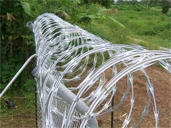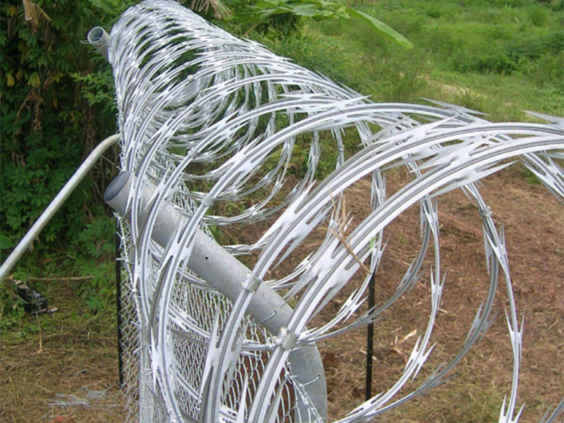 刀片刺网由热镀锌钢板或不锈钢薄板冲压出尖锐的刀片状,高张力镀锌钢丝或刀片刺绳者不锈钢丝做芯线组合而成的阻绝器材。由于刺网造形独特不易触摸,因而能达到很好的防护隔离效果。产品的主要材质有镀锌板和不锈钢板。